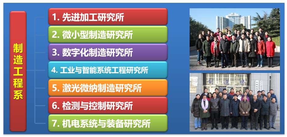制造工程系下设7个研究所:先进加工研究所、微小型制造研究所、数字化制造研究所、工业与智能系统工程研究所、激光微纳制造研究所、检测与控制研究所、机电系统与装备研究所。