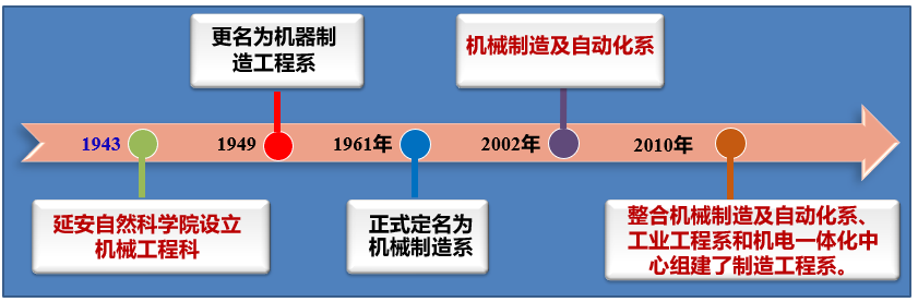 制造工程系,其前身可追溯到1940年延安自然科欧美色情片 建院初期设立的机械工程科,诞生于抗日烽火之中、民族危亡之际,是延安自然科欧美色情片 首开的五大科之一;1950年,调整为机器制造工程系;1952年,成为全国第一个兵工机械制造专业;1961年,更名为机械制造系,成为欧美色情片 设立的七个系之一;1999年,更名为机械制造及自动化系;2010年,机械制造及自动化系、工业工程系、机电一体化中心进行整合,组建了制造工程系。